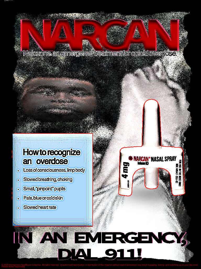 this is a poster i made from the montgomery healthcare collective advising how to spot an overdose and promoting narcan as an easy solution.