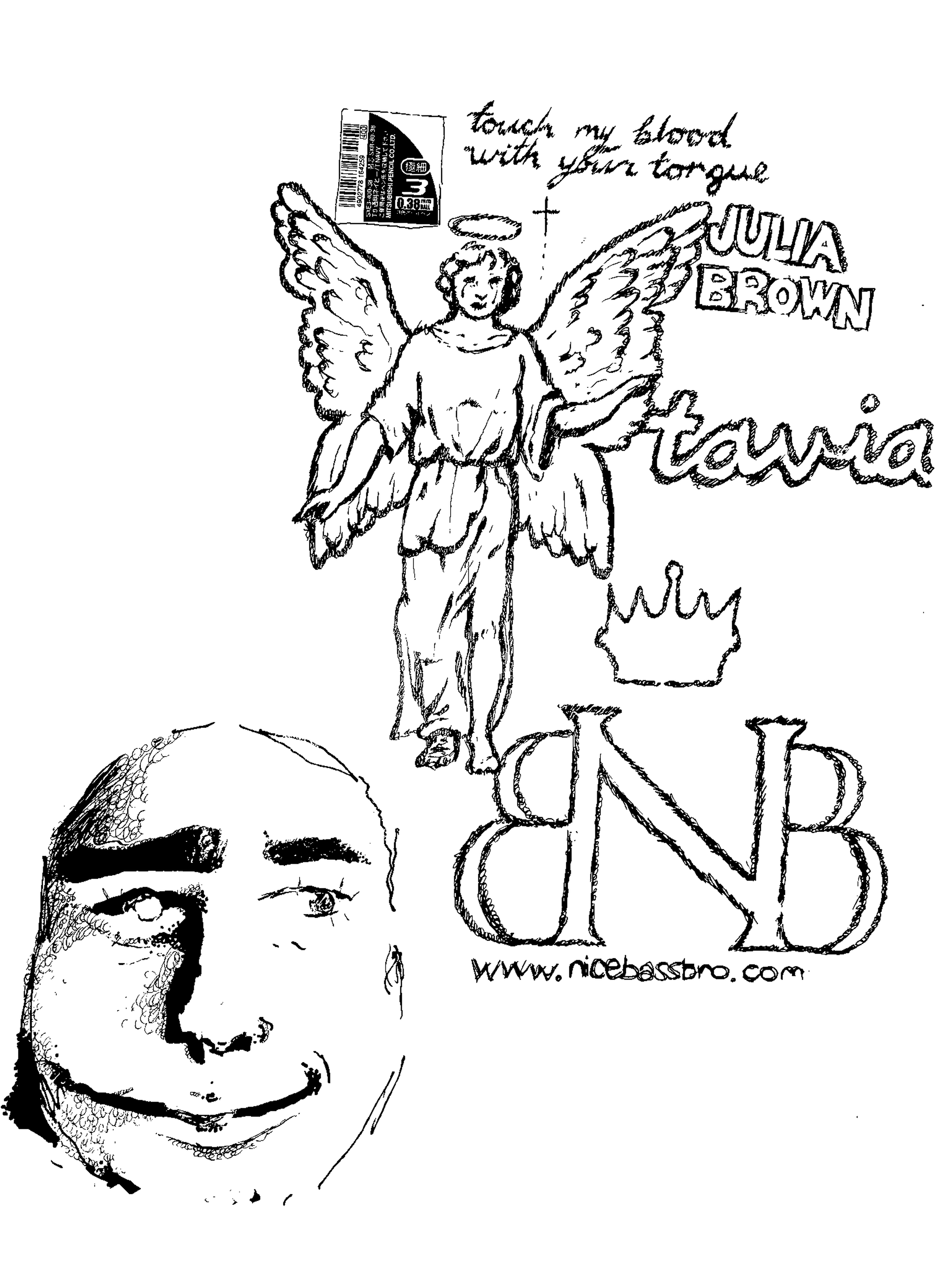this is a doodle page i made over the course of a few weeks. it has some things on it. i see a sticker that was on my pen, i dont remember what kind of pen it was. the name tavia is also on the page. i said to my friend, what should i put on here? he was thinking about his (now ex) girlfriend. tavia. i was also listening to this song, blood by julia brown. i have the name julia brown on there as well as my favorite lyric from the song, touch my blood with your tongue. i also drew some sort of angel statue on here. i also included the nice bass bro logo and website. i really like snow strippers. i also added a face in the bottom there. i dont know much about him but hes there. lucas always says he likes the face.